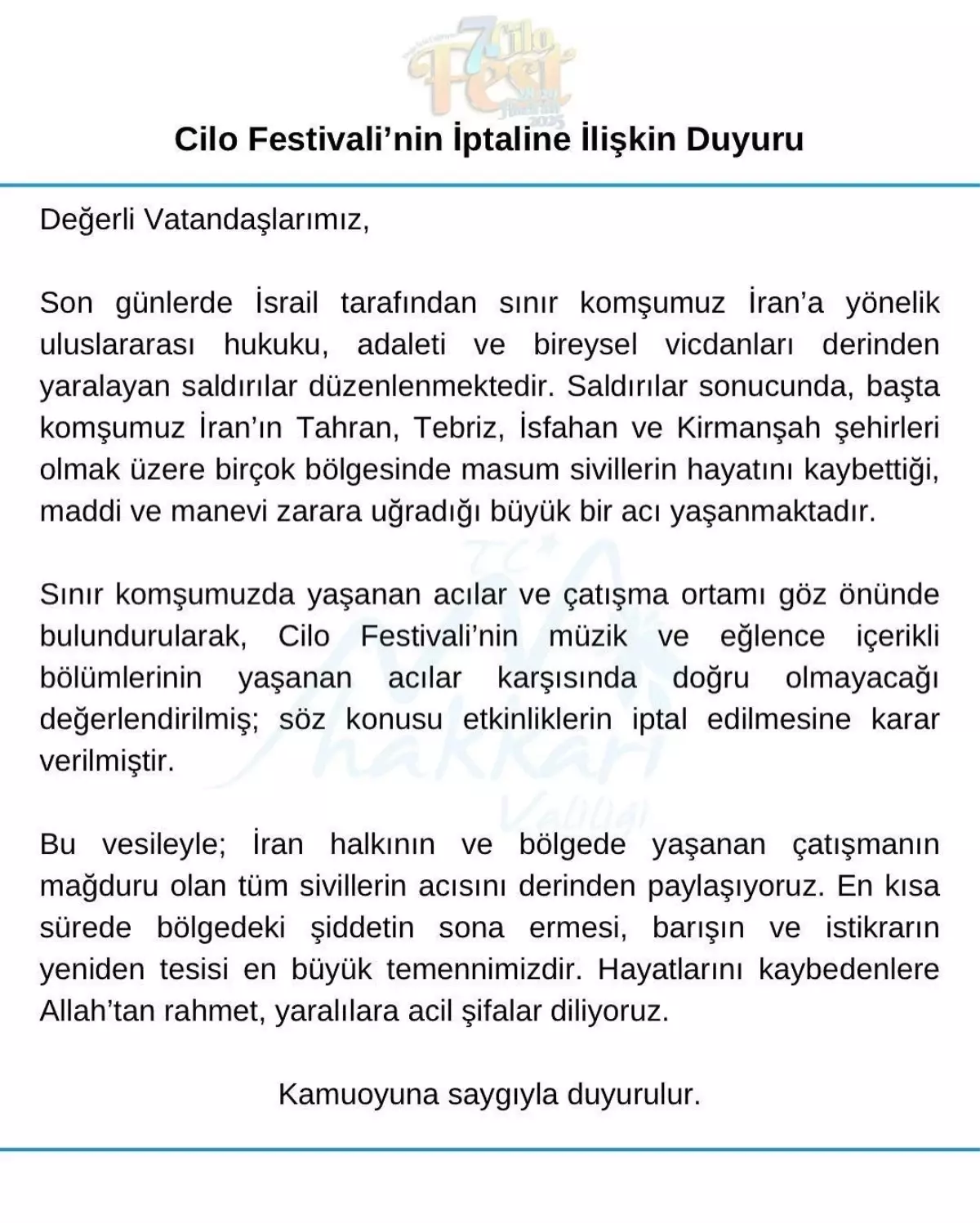 Hakkari Valiliği, Cilo Şenliği ile ilgili açıklama yaptı. Valilikten yapılan açıklamada, “Son günlerde İsrail tarafından hudut komşumuz İran‘a yönelik memleketler arası hukuku, adaleti ve kişisel vicdanları derinden yaralayan taarruzlar düzenlenmektedir. Hücumlar sonucunda, başta komşumuz İran‘ın Tahran, Tebriz, İsfahan ve Kirmanşah kentleri olmak üzere birçok bölgesinde günahsız sivillerin hayatını kaybettiği, maddi ve manevi ziyana uğradığı büyük bir acı yaşanmaktadır. Hudut komşumuzda yaşanan acılar ve çatışma ortamı göz önünde bulundurularak, Cilo Şenliği’nin müzik ve cümbüş içerikli kısımlarının yaşanan acılar karşısında yanlışsız olmayacağı değerlendirilmiş; kelam konusu aktifliklerin iptal edilmesine karar verilmiştir. Bu vesileyle; İran halkının ve bölgede yaşanan çatışmanın mağduru olan tüm sivillerin acısını derinden paylaşıyoruz. En kısa müddette bölgedeki şiddetin sona ermesi, barışın ve istikrarın yine tesisi en büyük temennimizdir. Hayatlarını kaybedenlere Allah’tan rahmet, yaralılara acil şifalar diliyoruz” denildi.